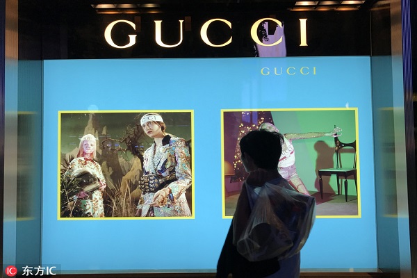 A pedestrian walks past a signboard of Gucci in Shanghai, October 3, 2017. [Photo/IC]