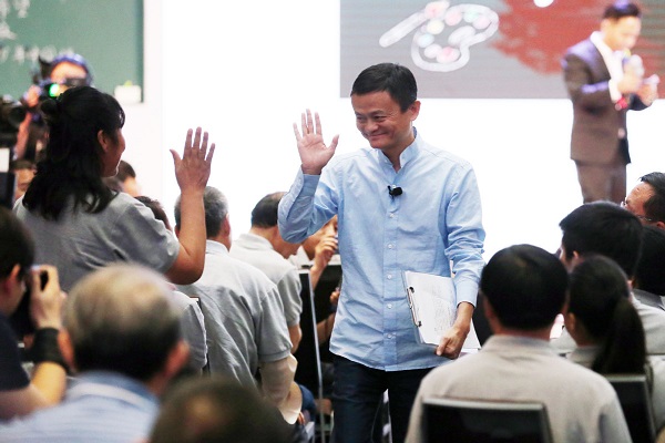 Jack Ma, founder and chairman of Alibaba, greets a rural teacher at a ceremony on Sunday for an award Ma initiated to honor rural teachers, in Sanya, Hainan province. Ma was elected chairman of the Business Leaders' Advisory Council for the Hainan Provincial People's Government. [Photo by Wang Zhuangfei / China Daily]