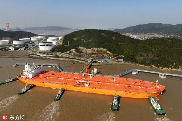 Tugboats dock the oil tanker Eagle Varna carrying imported crude oil at the Port of Zhoushan in Zhoushan city, East China's Zhejiang province, July 4, 2018. [Photo/IC]