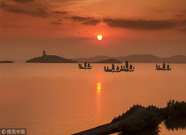 The stunning sunrise view at Suzhou Taihu Lake National Tourist Resort [Photo/VCG]