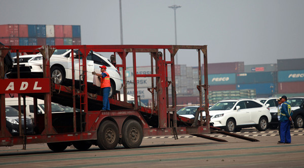 An employee loads cars onto a transporter at Tianjin Port. [Photo/China Daily]