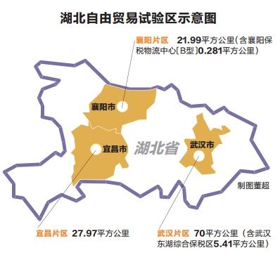 It takes up about 120 square kilometers, including 70 sq km in the East Lake High-tech Development Zone in Wuhan (covering the 5.41-sq-km Wuhan East Lake Comprehensive Bonded Zone), 21.99 sq km in Xiangyang (covering the 0.281-sq-km Xiangyang Bonded Logistics Center) and 27.97 sq km in Yichang.