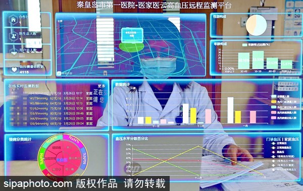 Doctors check patients' blood pressure statistics via a digital medical platform at the First Hospital of Qinhuangdao on March 26, 2020. [Photo/Sipa]