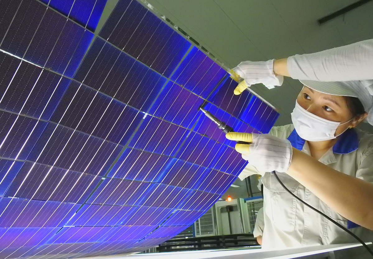 Employees work on a solar panel assembly line at a new energy company in Lianyungang, Jiangsu province. [Photo by Geng Yuhe/for China Daily]