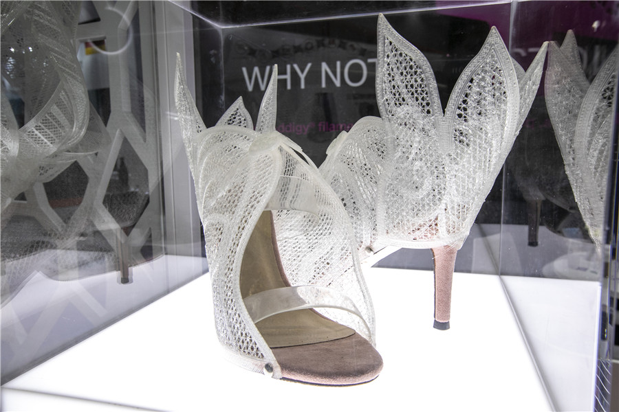 A pair of 3D-printed shoes on display at an expo in Shanghai on May 28, 2021. [Photo/IC]