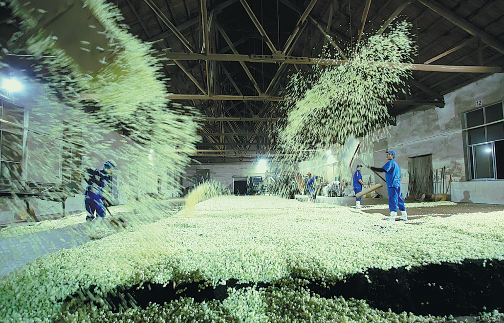 Workers process jasmine tea at a factory in Hengxian county. HUANG RUDE/YU XIANGQUAN/FOR CHINA DAILY