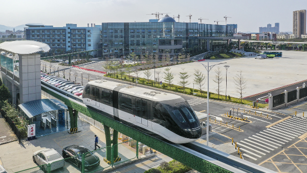 An electric train runs on BYD's Cloud Rail, a straddle-type monorail, at the company's headquarters in Shenzhen, Guangdong province in February. [Photo by Zhu Hongbo/For China Daily]