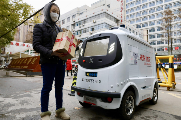 A customer picks up her delivery from an autopilot robot in Wuhan, Hubei province. [Photo by Zhu Xingxin/China Daily]