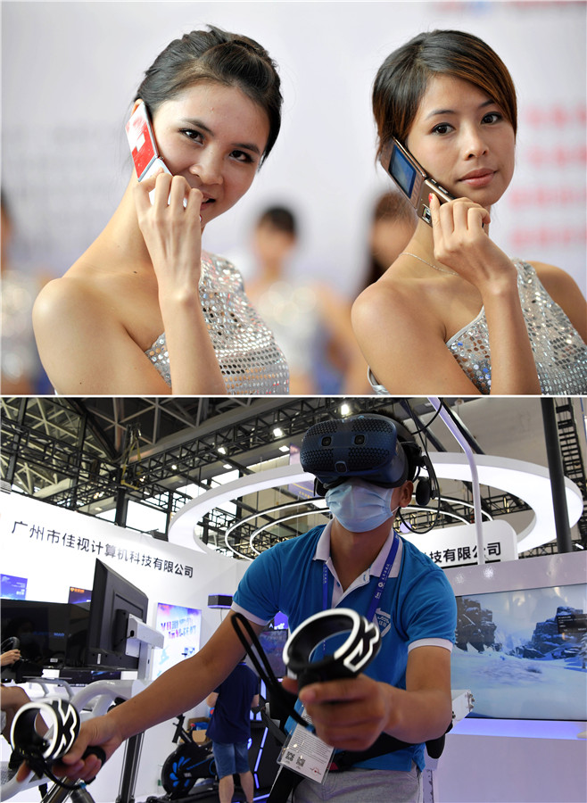 The upper photo shows models with the latest mobile phones at the seventh China-ASEAN Expo in Nanning, capital of South China's Guangxi Zhuang autonomous region, on Oct 22, 2010. The lower photo shows a man operating virtual reality sports equipment at the 18th China-ASEAN Expo in Nanning on Sept 11, 2021. [Photo/Xinhua]