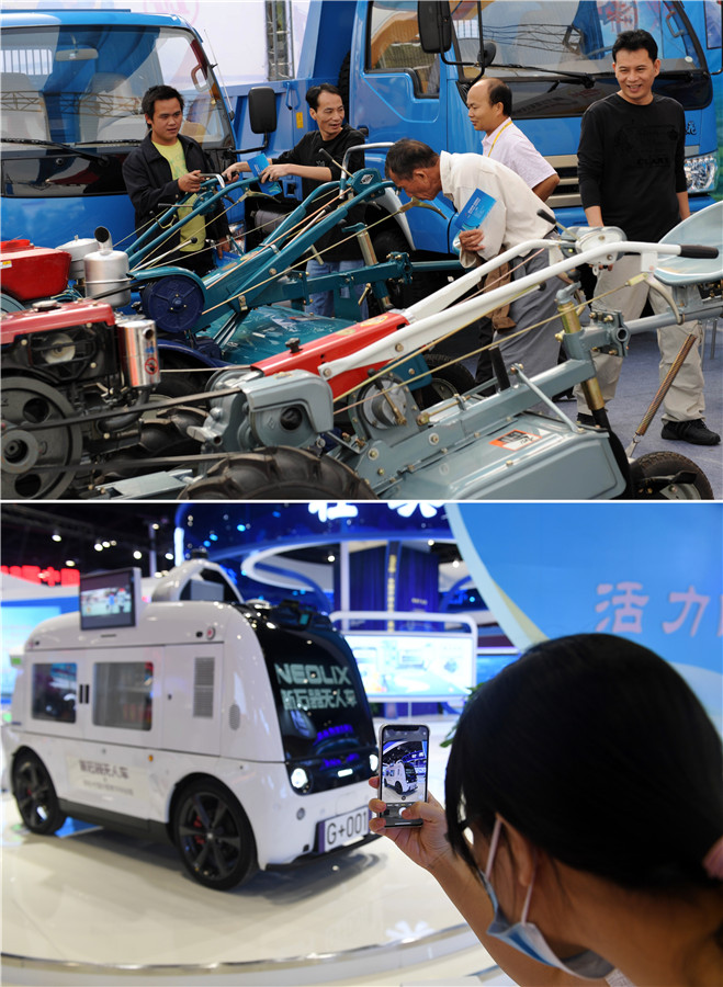 The upper photo shows people looking at hand tractors at the fifth China-ASEAN Expo in Nanning, capital of South China's Guangxi Zhuang autonomous region, on Oct 25, 2008. The lower photo shows a visitor taking photos of an unmanned vehicle at the 18th China-ASEAN Expo in Nanning on Sept 11, 2021. [Photo/Xinhua]