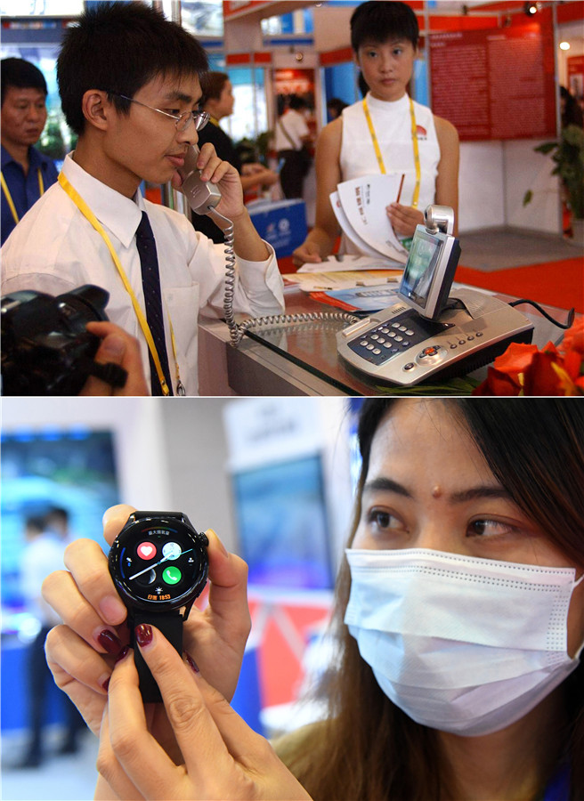 The upper photo shows a man making a call via a telephone at the second China-ASEAN Expo in Nanning, capital of South China's Guangxi Zhuang autonomous region, on Oct 19, 2005. The lower photo shows a woman with a watch with phone calling function at the 18th China-ASEAN Expo in Nanning on Sept 12, 2021. [Photo/Xinhua]