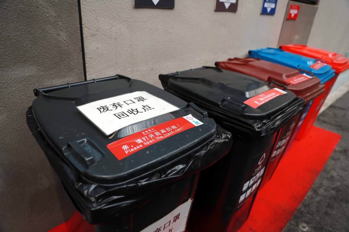 Rubbish bins collecting used masks line up to serve guests for the upcoming China International Import Expo in Shanghai on Oct 29, 2021. [Photo/IC]