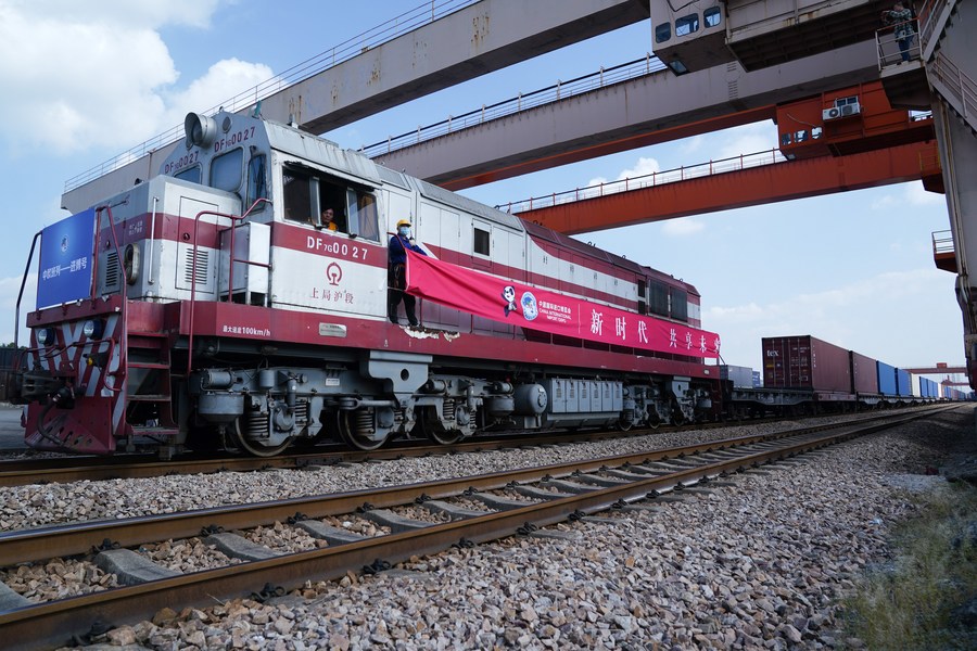 The first "Jinbo" China-Europe freight train is seen upon its arrival in Shanghai, East China, Oct 29, 2021. Its arrival marks the first time for exhibits of the China International Import Expo (CIIE) to be sent by the freight train to the municipality. [Photo/Xinhua]