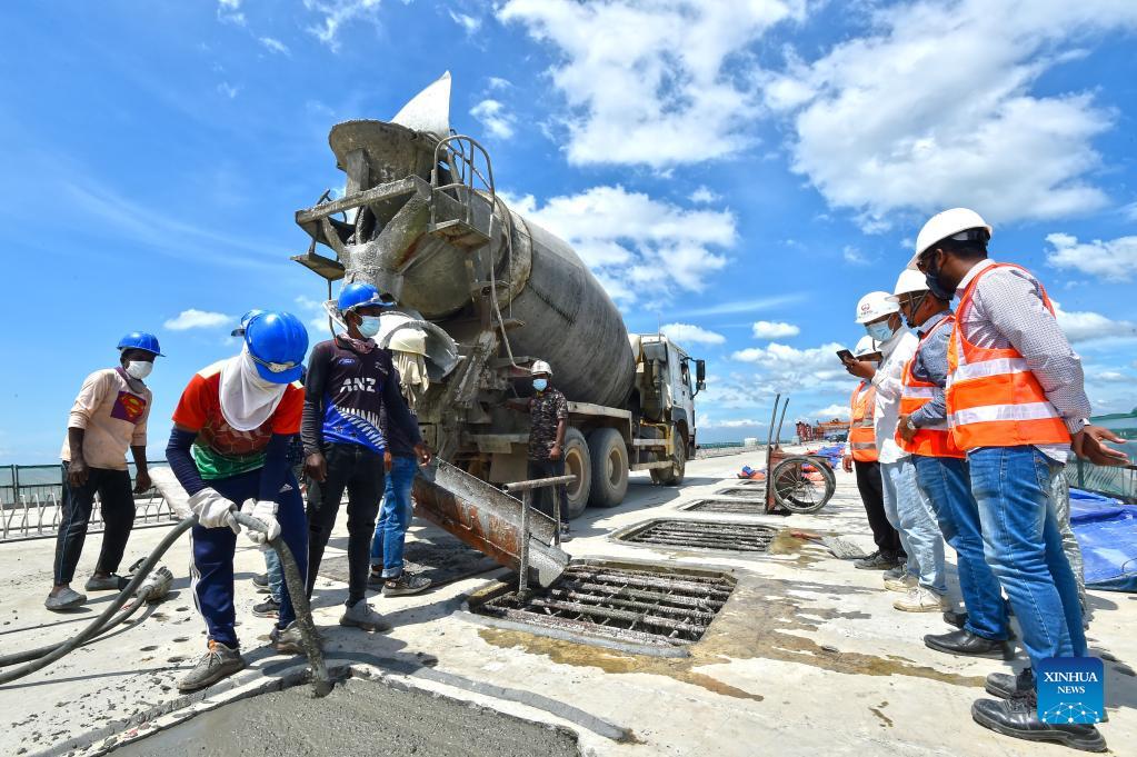 People work at a construction site of Padma Multipurpose Bridge Project in Munshiganj on the outskirts of Dhaka, Bangladesh, on Sept 12, 2021. [Photo/Xinhua]