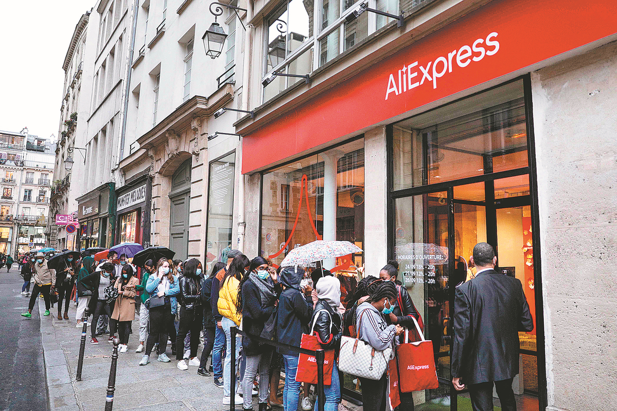 A line forms to view fashion items at an AliExpress pop-up store in Paris in September 2020. [GEOFFROY VAN DER HASSELT/AFP]
