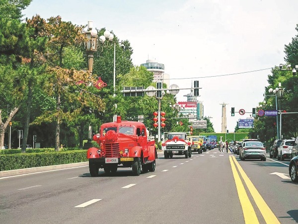 Seventeen trucks made by FAW Jiefang Automotive Co drive through Changchun, Jilin province, on the occasion of the carmaker's 70th anniversary. [Photo provided to China Daily]