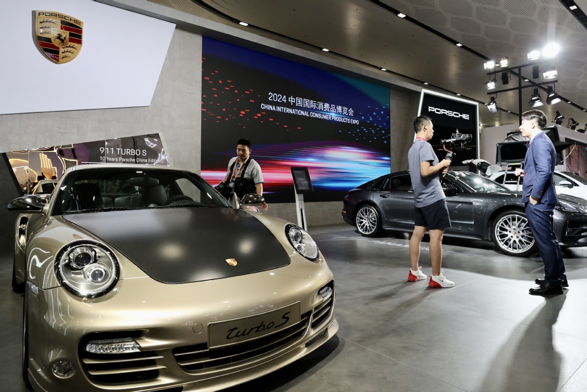 Vehicles are seen at the exhibition area of fashion and life at the Hainan International Convention and Exhibition Center, the main venue for the fourth China International Consumer Products Expo, in Haikou, South China's Hainan province, April 13, 2024. [Photo by Zhang Wei/chinadaily.com.cn]