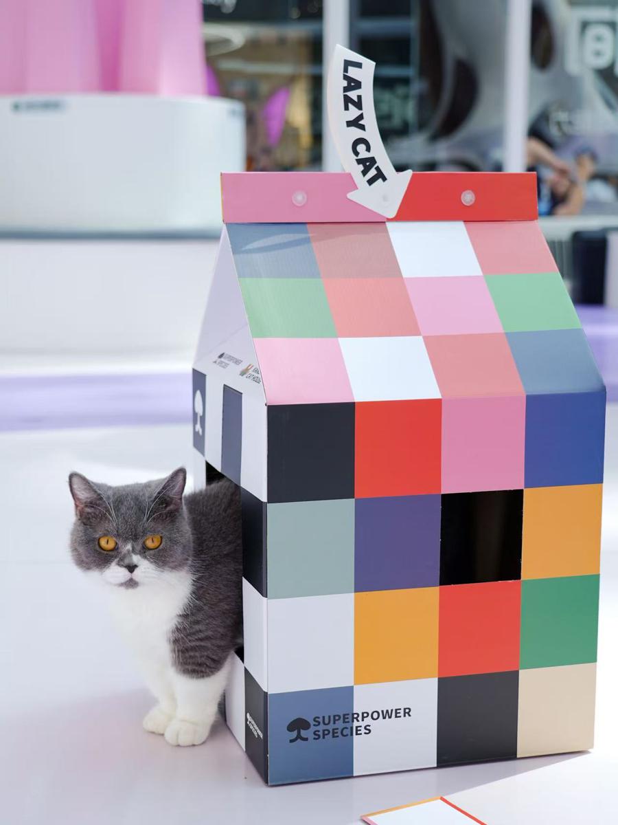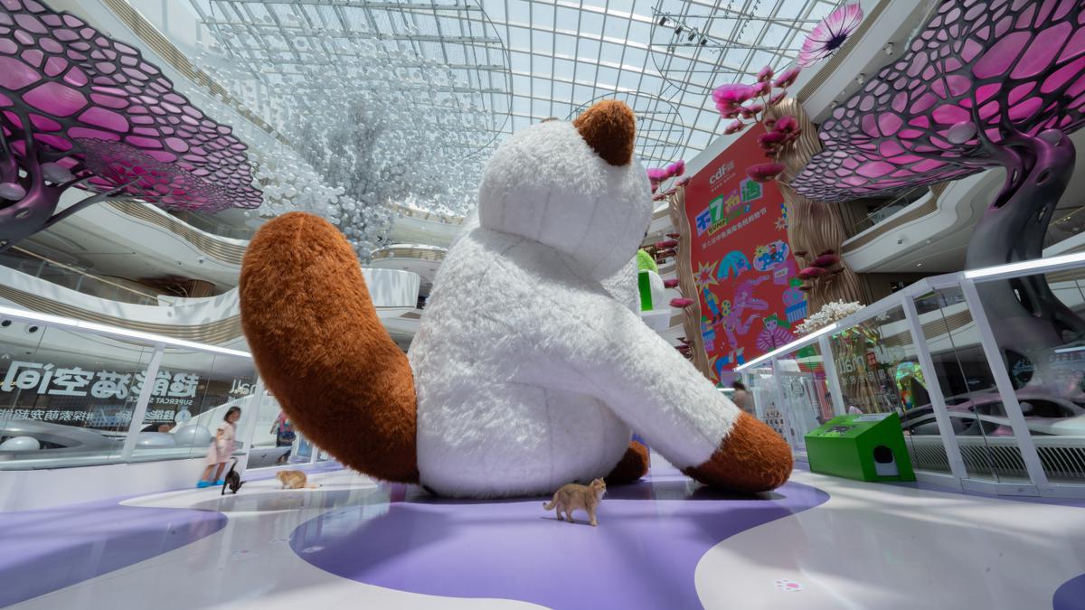 The Super Cat Space on the mall's first floor features play areas, feeding stations, and interactive sections where shoppers can pet breeds like British Shorthairs, Devon Rexes, Persians, and Garfield.